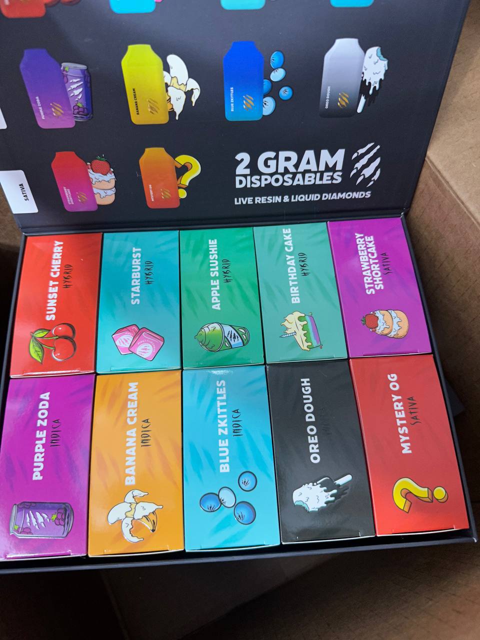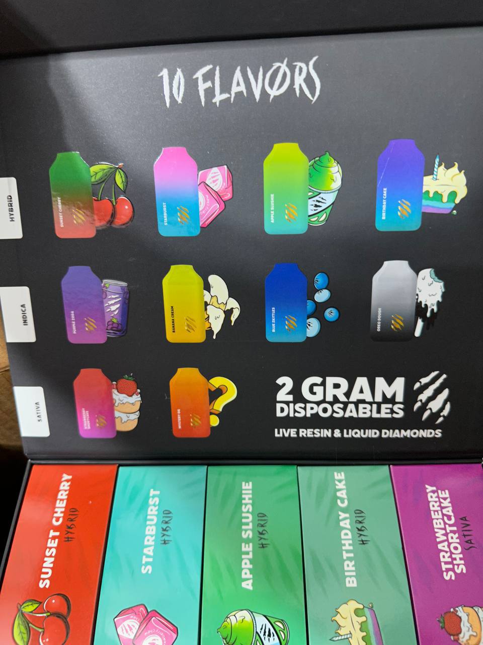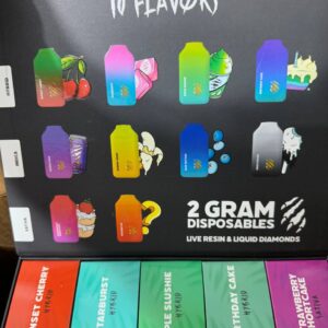 | FLAVORS | APPLE SLUSHIE (HYBRID), Banana Cream (Indica), Birthday cake (hybrid), Blue Zkittles (Indica), Mystery OG (Sative), Oreo Dough (Indica), Purple Zoda (Indica), Starburst (Hybrid), Strawberry Shortcake (Sativa), Sunset Cherry (Hybrid) |