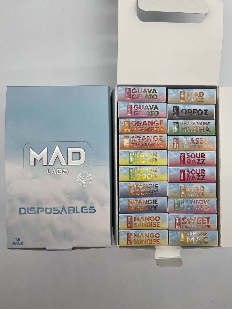 | FLAVORS | Banana Mac, Classic glazed donuts, Coconut runtz, Guava gelato, Kiwi fruit, Lemon drop, Mad sauce, Mango Sunrise, ORANGE CREAMSICLE, Oreoz, Paris og, Peaches n cream, Peppermint mocha, Pistachio ice cream, Rainbow gelato, Sour Apple, Sour razz, Sweet cantaloupe, Tangie berry, Watermelon kiwi |